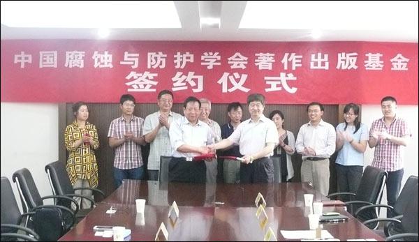 2014年5月22日,在国家大力倡导全民阅读的战略形势下,“中国腐蚀与防护学会著作出版基金”正式成立,并在北京同化学工业出版社进行了签约仪式。中国腐蚀与防护学会理事长陈光章、秘书长李晓刚、高级顾问杨德钧、秘书处秘书杨吉可;化学工业出版社社长周伟斌、总编室主任、副主任等一行出席了本次签约仪式,并签署了相关协议。